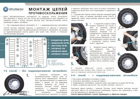 Цепи противоскольжения представляют собой сетку из круглозвенных цепей равномерно оплетающую шину по всей окружности. По сути это съемный протектор способный превратить обычную дорожную покрышку в колесо для бездорожья. Состоит из двух продольных цепей, проходящих по внутренней и наружной окружностям колеса соединенных поперечными цепями.